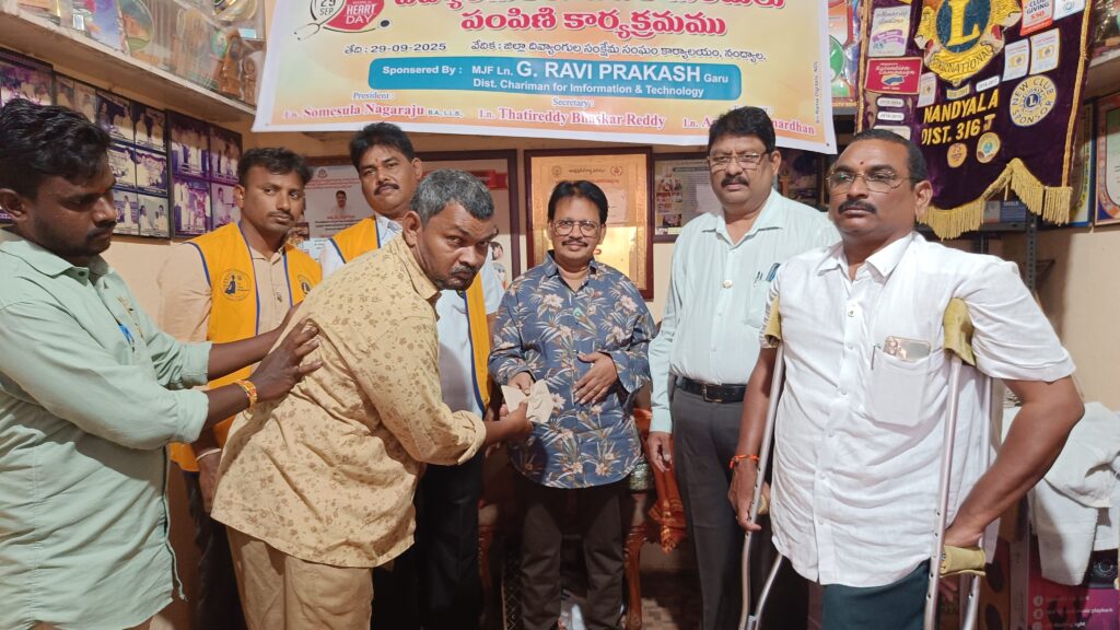 నంద్యాల లయన్స్ క్లబ్ ఆధ్వర్యంలో, నంద్యాల జిల్లా దివ్యాంగుల సంక్షేమ సంఘం నిర్వహణలో సోమవారం సంఘం కార్యాలయంలో ప్రపంచ గుండె దినోత్సవం పురస్కరించుకుని, 20 మంది దివ్యాంగులకు లయన్స్ క్లబ్ జిల్లా చైర్మన్, కళారాధన కార్యనిర్వాహక కార్యదర్శి రవి ప్రకాష్ సౌజన్యంతో పదిహేను వేల రూపాయల విలువచేసే నెల వారి మందుల పంపిణీ చేశారు.