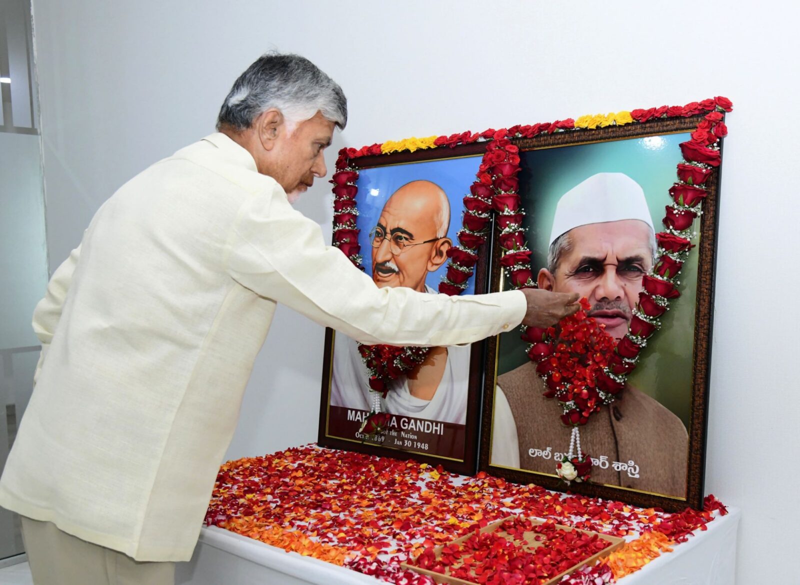 గురువారం జాతిపిత మహాత్మా గాంధీ, మాజీ ప్రధాని లాల్ బహదూర్ శాస్త్రి గార్ల జయంతి సందర్భంగా క్యాంప్ కార్యాలయంలో వారి చిత్రపటాలకు పూలమాల వేసి ముఖ్యమంత్రి చంద్రబాబు నాయుడు నివాళులర్పించారు.