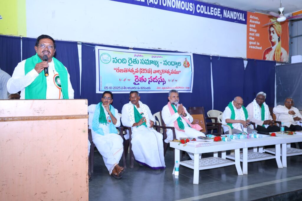 నంద్యాలలో ఆదివారం నంది రైతు సమాఖ్య రజతోత్సవ వార్షికోత్సవం రామకృష్ణ డిగ్రీ కళాశాల వివేకానంద ఆడిటోరియంలో ఘనంగా నిర్వహించారు. ఈ సందర్భంగా నంది రైతు సమాఖ్య 25 సంవత్సరాల ప్రత్యేక వార్షిక సంచికను అతిథులు, రైతులు, రైతు నాయకులు ఆవిష్కరించారు.నంది రైతు సమాఖ్య ముఖ్య సలహాదారులు డాక్టర్ రవీంద్రనాథ్ అధ్యక్షతన జరిగిన ఈ కార్యక్రమంలో మాజీ పార్లమెంటు సభ్యులు పోచా బ్రహ్మానందరెడ్డి, ఎమ్మెల్సీ ఇసాక్ బాషా అతిధులుగా పాల్గొన్నారు.
