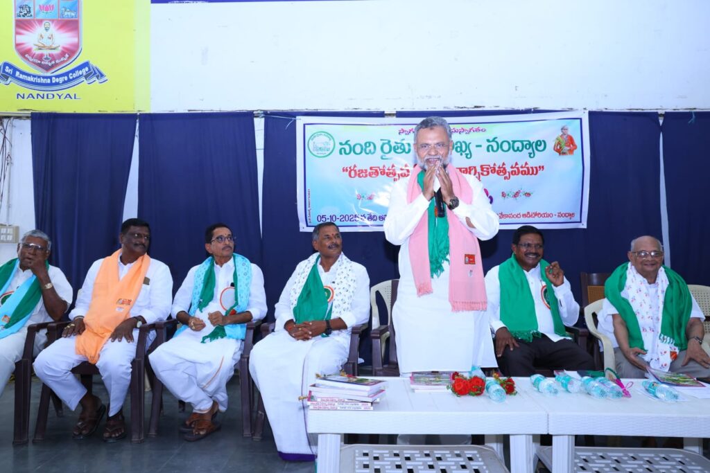రైతు నాయకులు రామ సుబ్బారెడ్డి మాట్లాడుతూ శ్రీశైలం, పోతిరెడ్డిపాడు జలాశయాల నీటిని రాయలసీమ రైతులకు సద్వినియోగం చేసుకోవడానికి వీలుగా పరిమితిని పెంచాలన్నారు.. రైతు సమాఖ్య ఉపాధ్యక్షులు చంద్రశేఖర్ రెడ్డి, ప్రధాన కార్యదర్శి కృష్ణారెడ్డి, కోఆర్డినేటర్ ఓబుళపతి మాట్లాడుతూ నంది రైతు సమాఖ్య 25 సంవత్సరాలు పూర్తి చేసుకున్న సందర్భంగా విడుదల చేసిన రజతోత్సవ సంచికలో రైతాంగానికి ఉపయోగపడే పలు వ్యాసాలు, శాస్త్రవేత్తల సూచనలు పొందుపరిచామన్నారు..